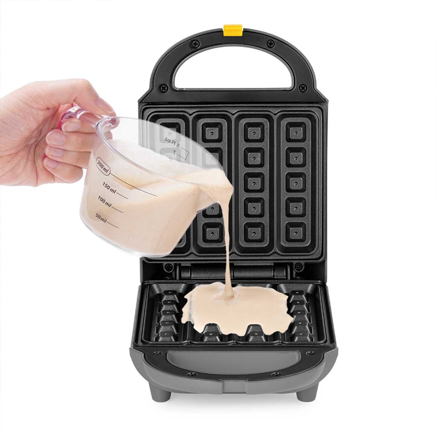 - + Вафельница очень проста и удобна в использовании. Вафли получились с первой попытки. Прожариваются с обеих сторон равномерно. Компактная при этом можно приготовить сразу четыре вафли.