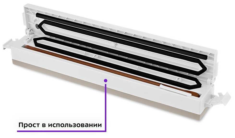 - Прибор справляется с рифленой стороной пакетов вниз, что минимизирует риск деформации и повышает качество сварки даже при неоднородном содержимом.