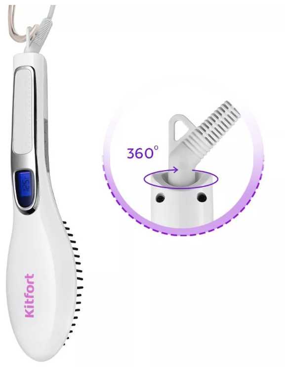 - + Быстро нагревается, длинный шнур с функцией вращения, защита от ожога по периметру расчески
