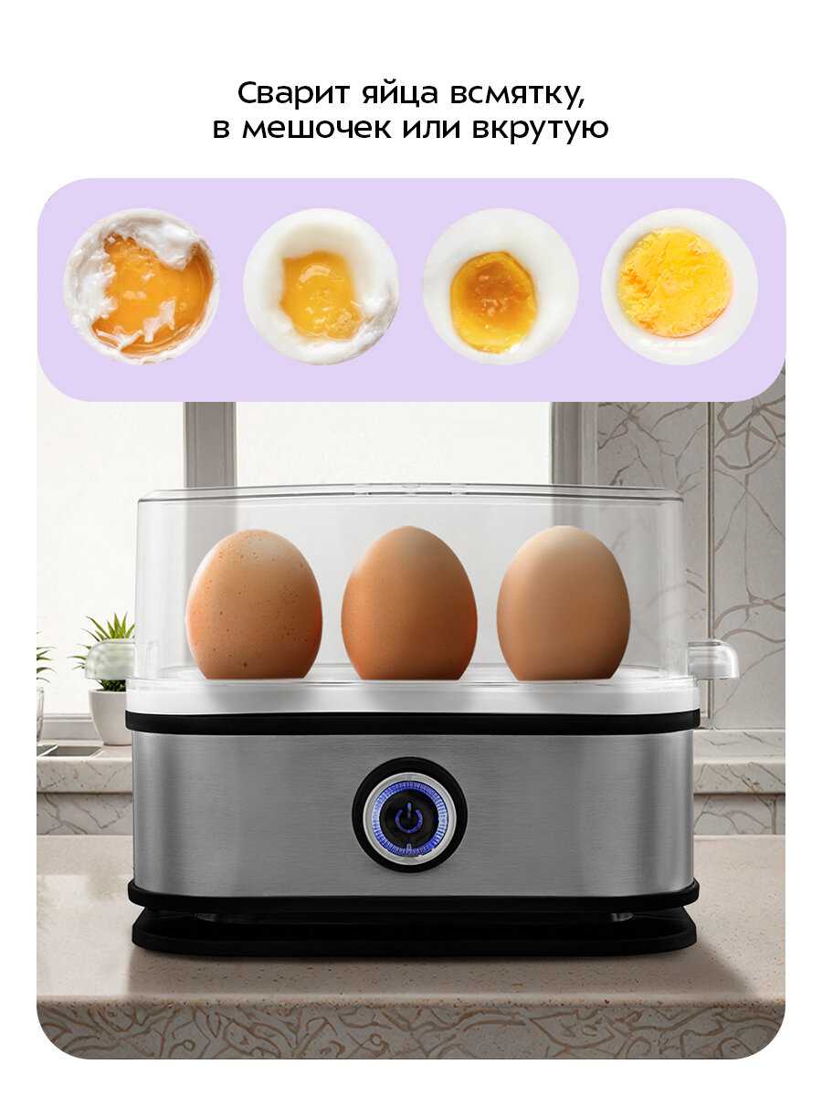 - + У нас уже вторая такая варка для яиц, предыдущая была на три штуки, но с ростом семьи пришлось взять побольше. Иногда готовлю ребенку омлет из одного яйца прямо на завтрак, используя силиконовые формочки, и это реально упрощает процесс. Главные преимущества: устройство работает на ура, яйца в смятку получаются каждый раз как надо, без промахов. Идеальный вариант для таких задач.
