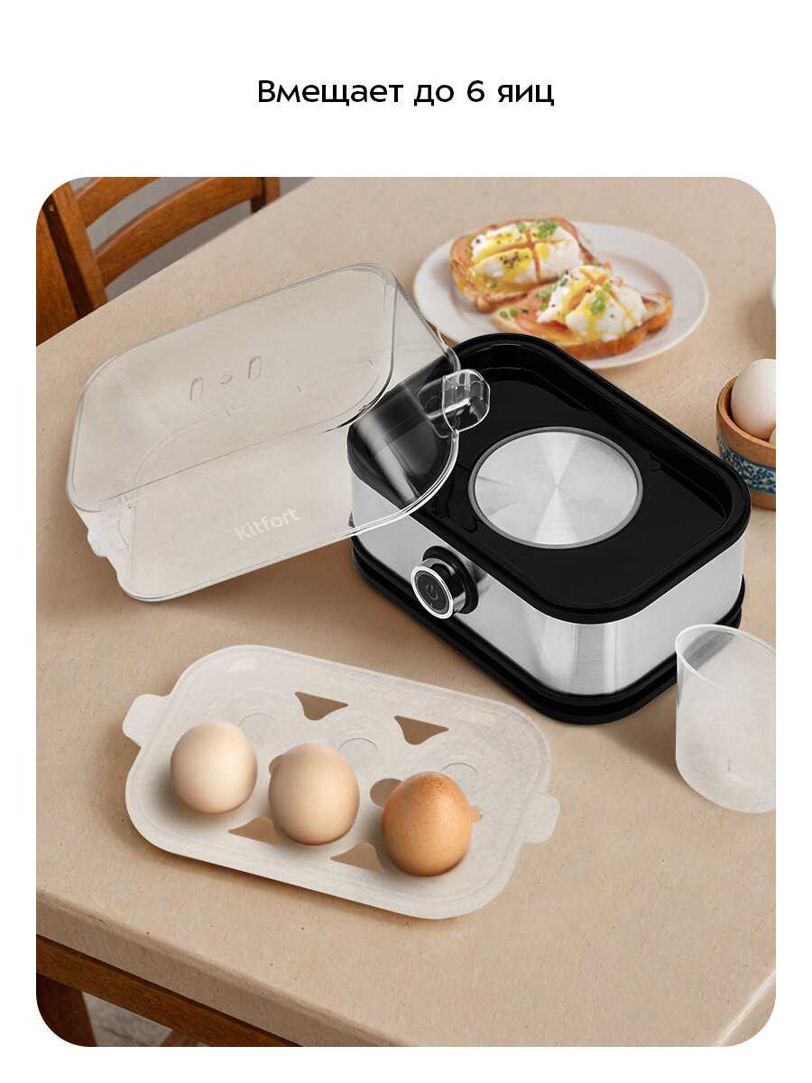 Приобрели яйцеварку Kitfort KT-6936 для крутого завтрака. Очень довольны этой техникой. Не надо ждать у плиты и высчитывать время, чтобы сварить яйца в мешочек, всмятку или вкрутую. Одновременно можно приготовить от 1 до 6 яиц. Всё очень просто с этой техникой. Залить воду и включить таймер, всё. Мы рады этой покупке!
