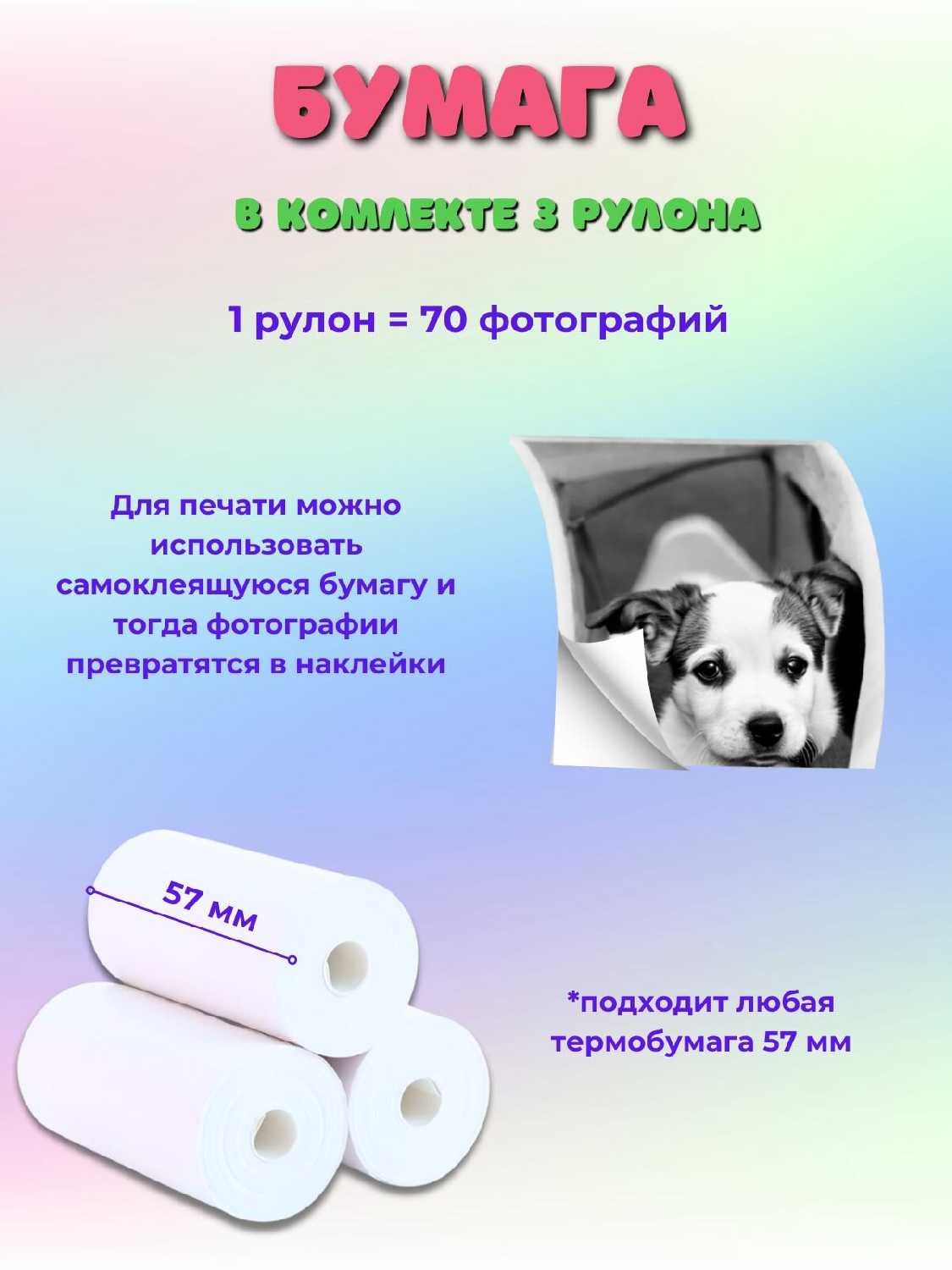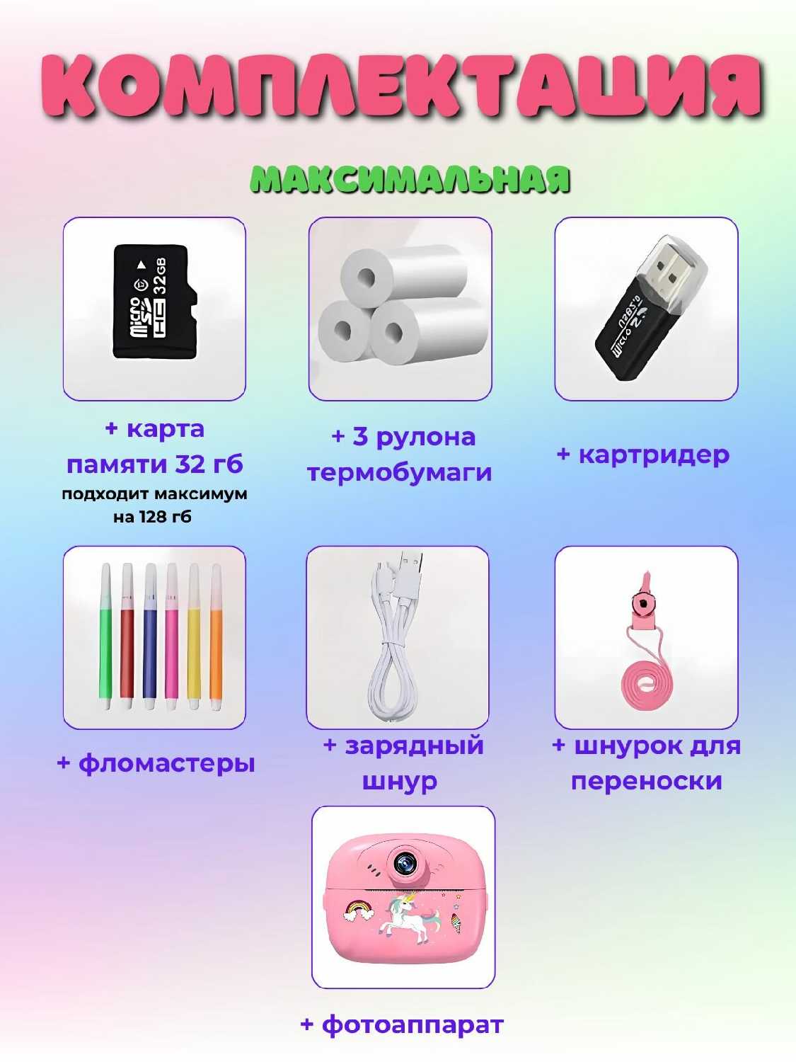 - + USB-C разъем для зарядки+кабель в комплекте, меню на русском, легкий, ремешок на шею, карта памяти 32Gb, переходник с карты памяти на USB для компьютера, 3 рулона бумаги для фото