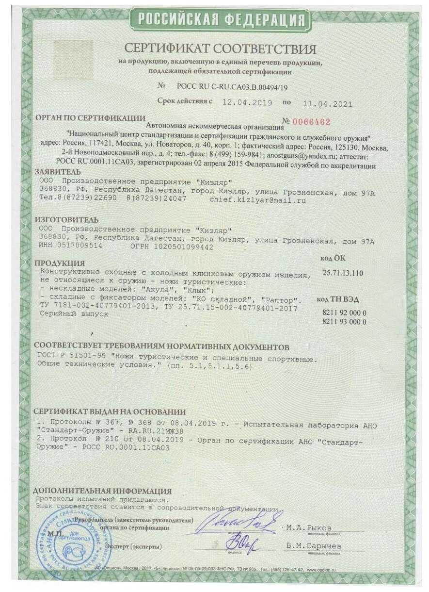 Дополнительная информация : | марка стали: AUS-8, длина сложенного: 126 мм, заточка: прямая |