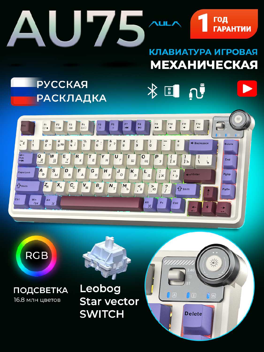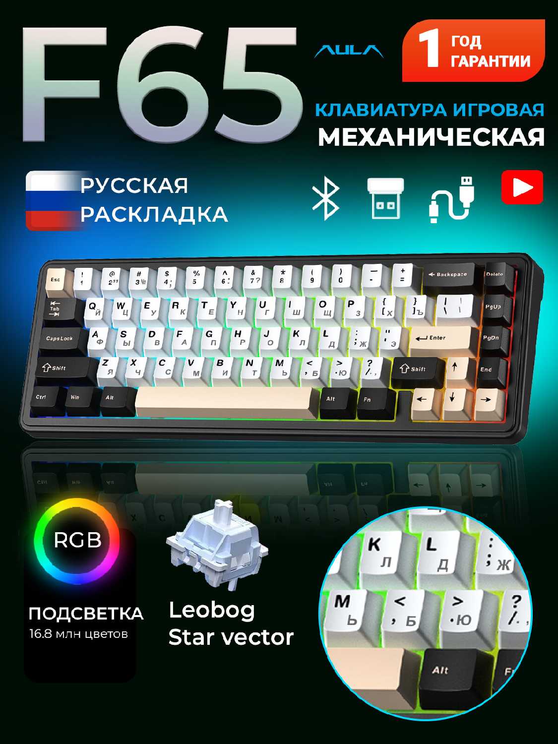 6.8/10 балловAULA F65 [Проводное, Bluetooth, 2.4 Ггц]