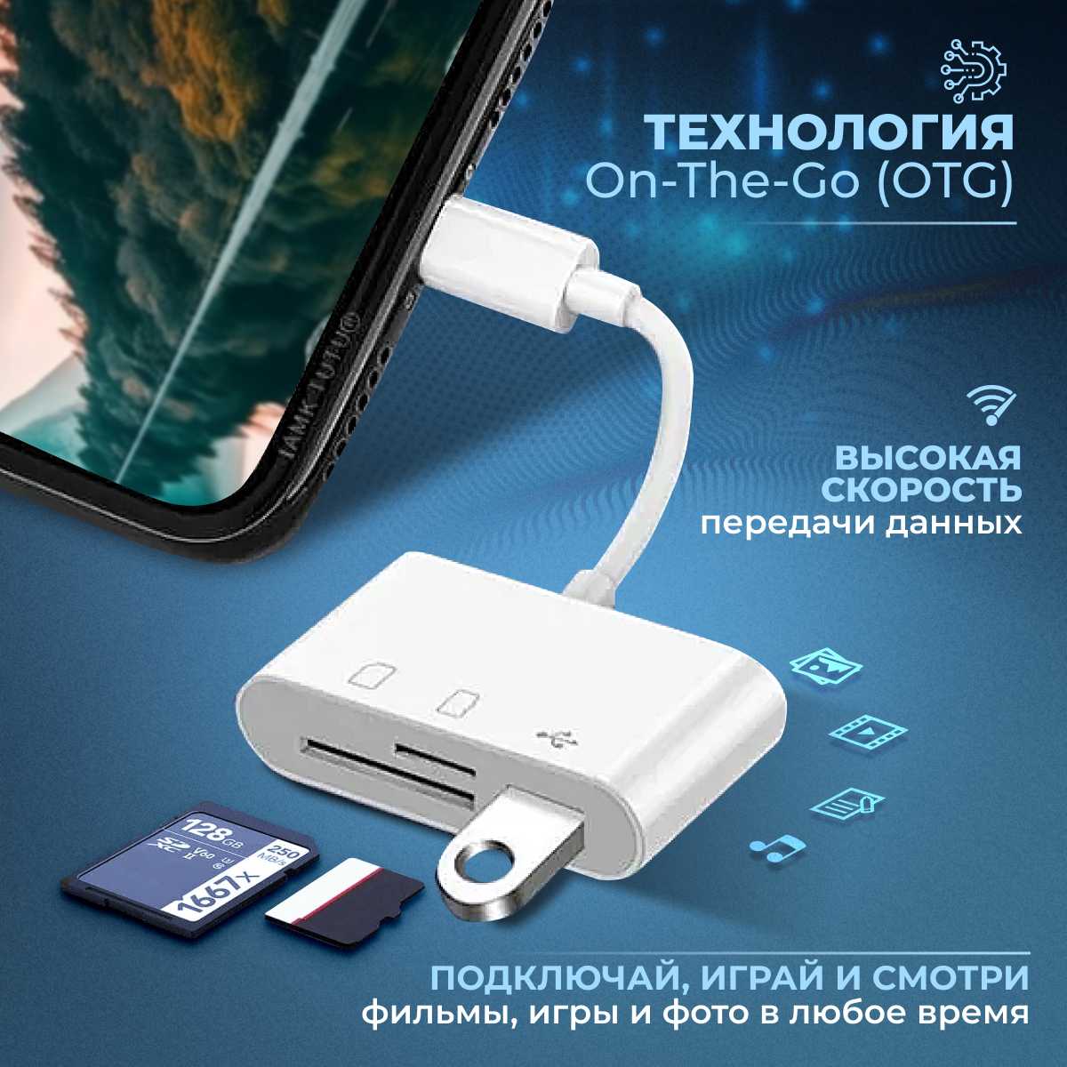 - Читает SD и microSD карты для переноса фото с фотоаппарата на телефон.
