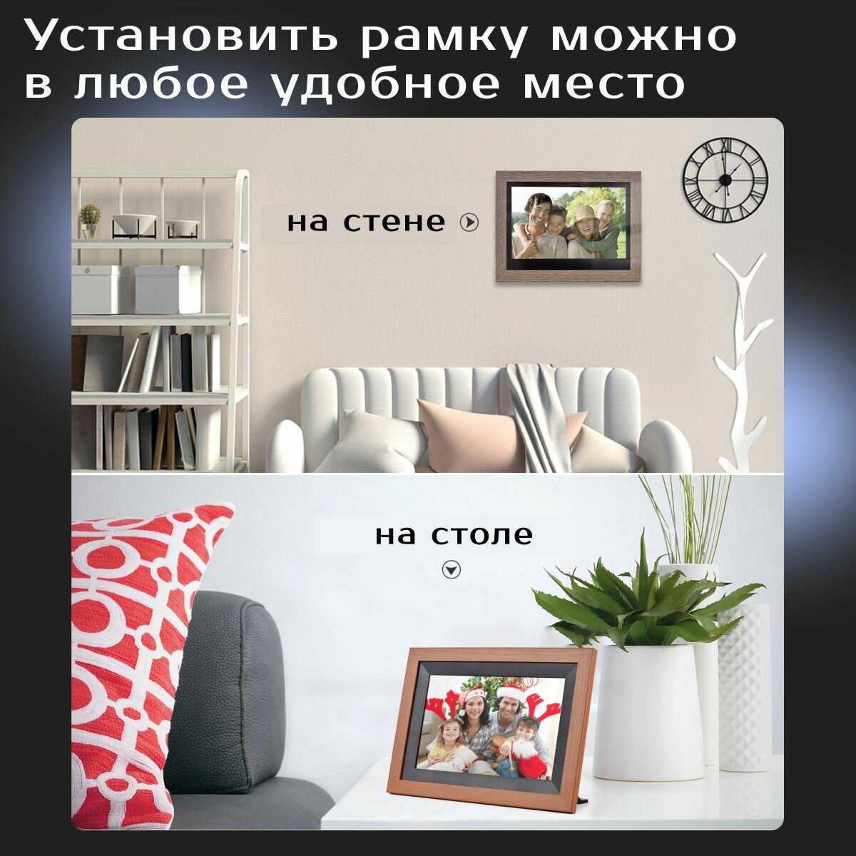 - + Качественная рамка. Удобная функция закидывания фото по Wi-Fi.