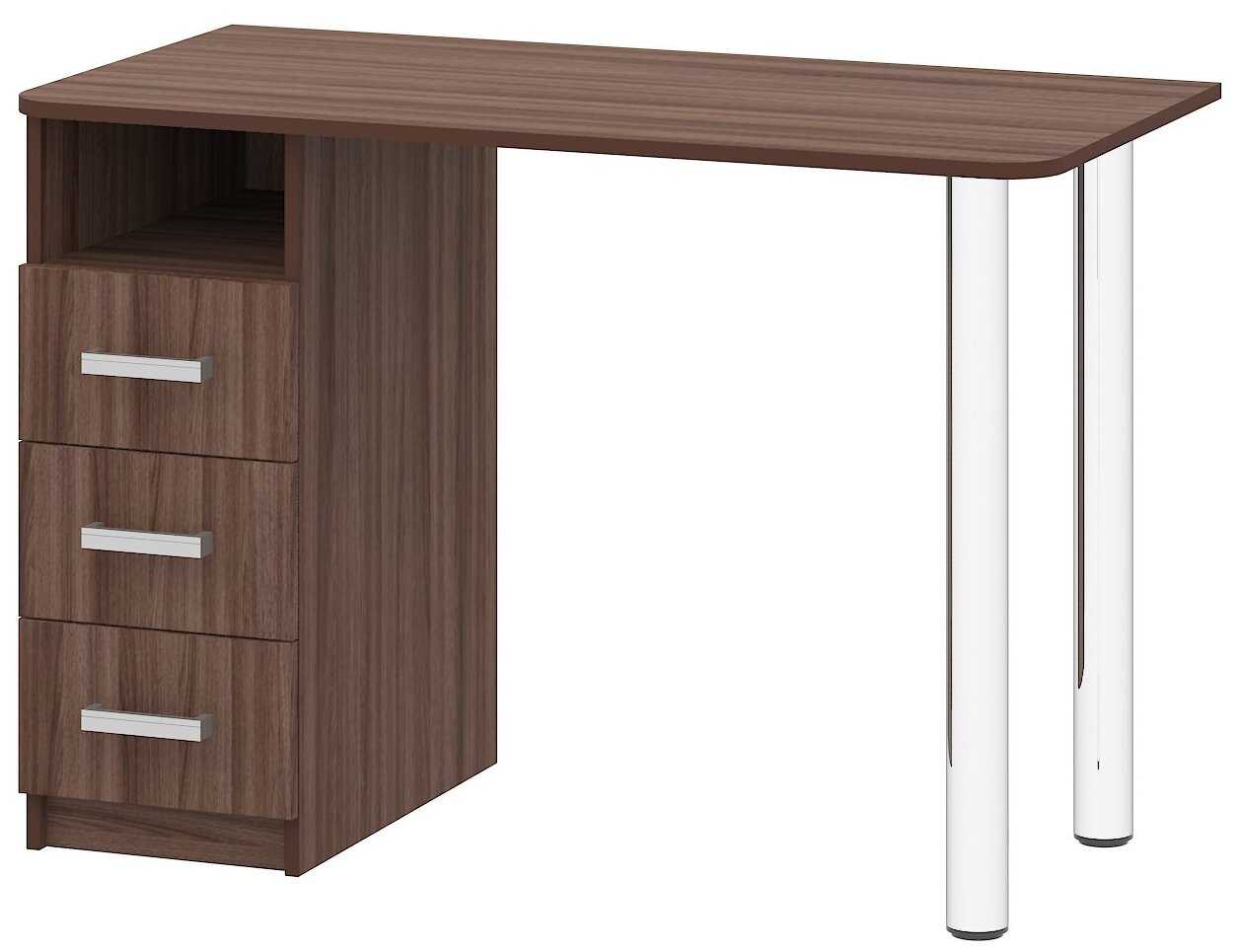 - + Достоинствами стола считаю металлические ножки (раздвигают пространство комнаты), закруглённые края передней части столешницы и механизм выдвижения ящиков