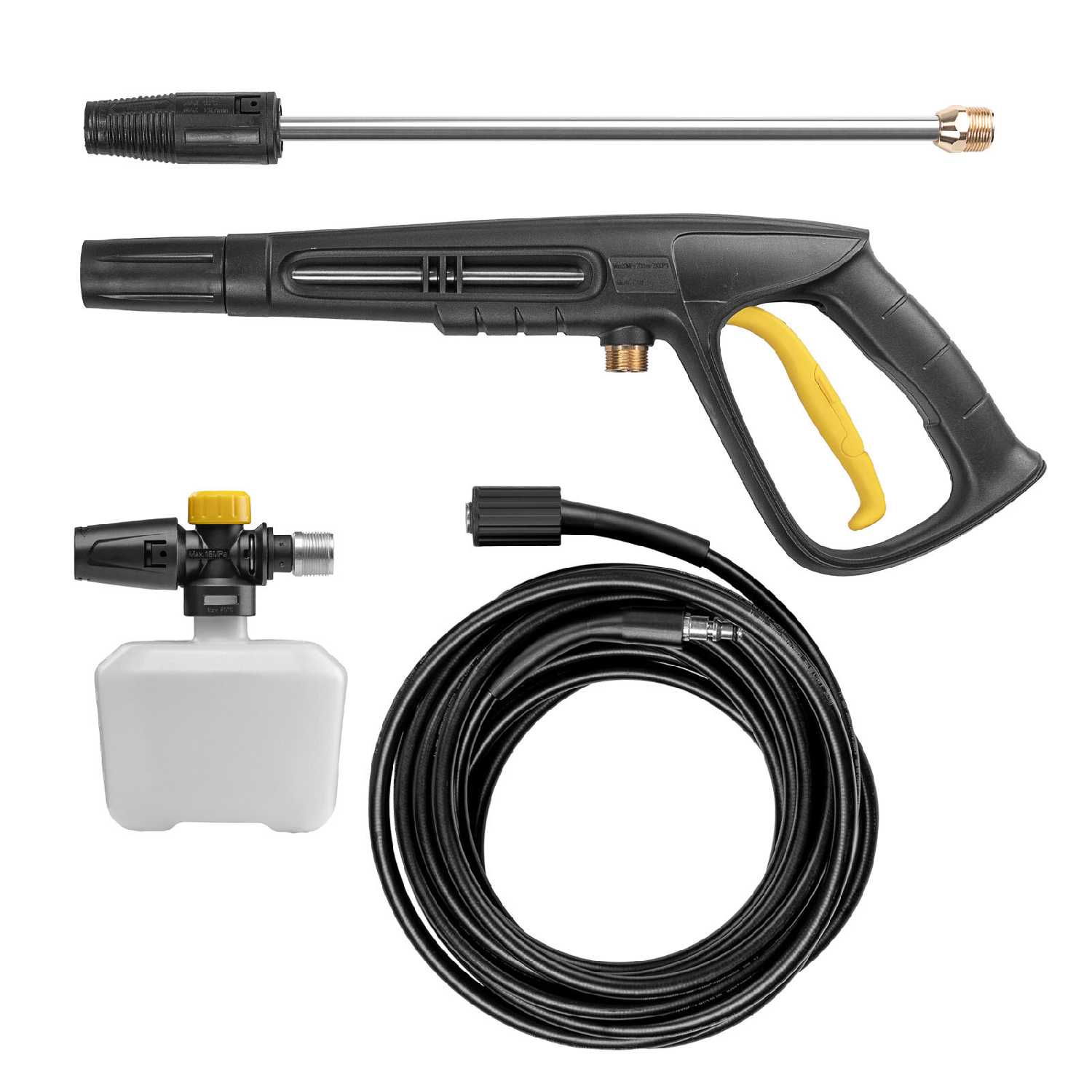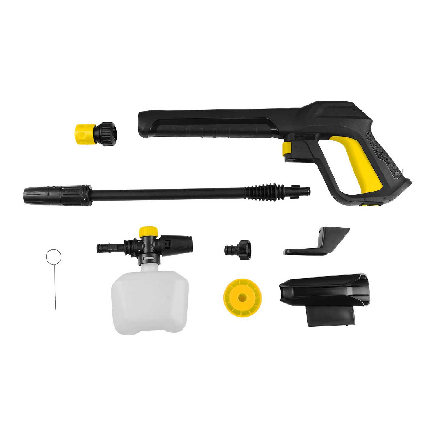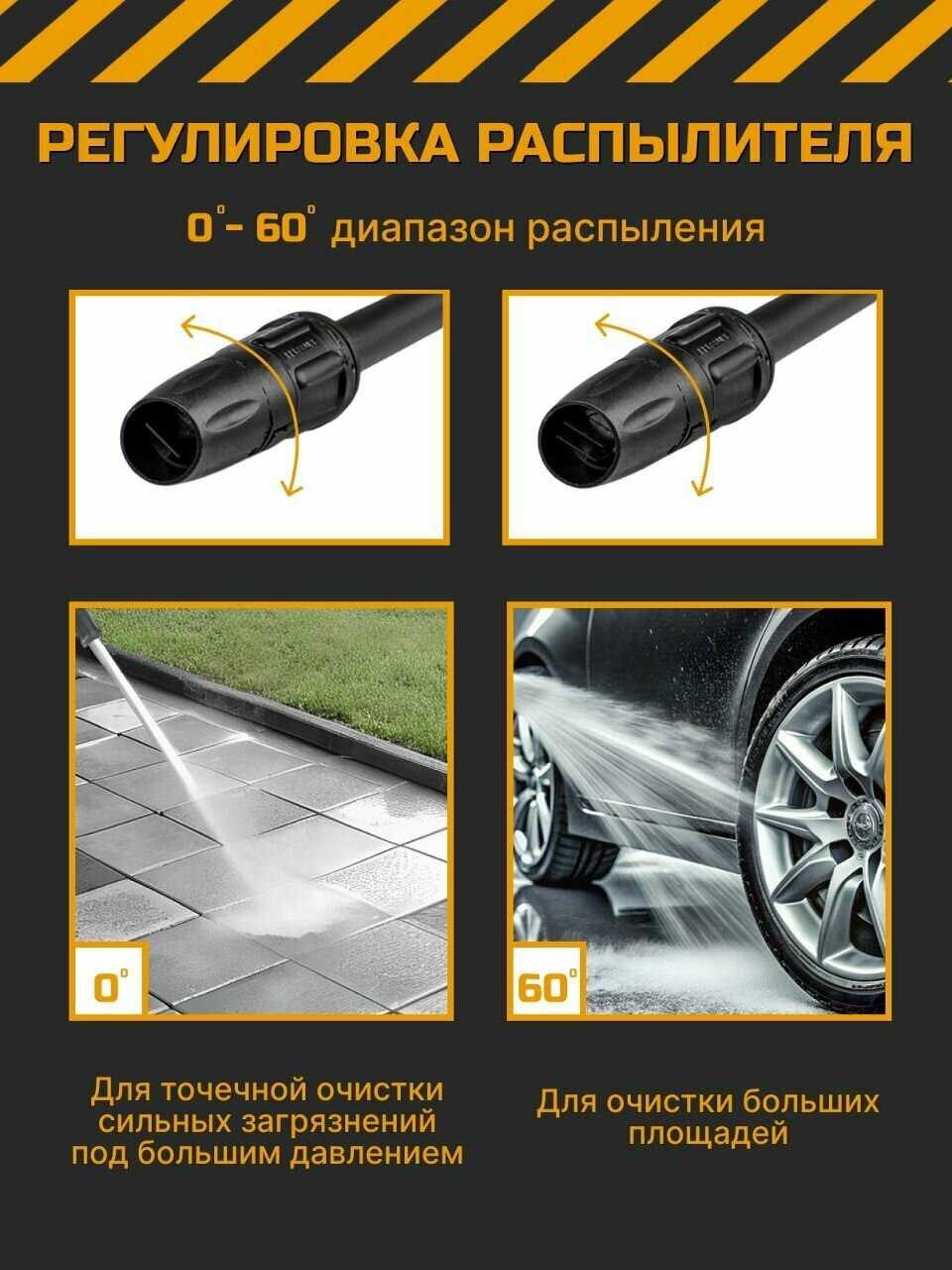 В комплект входят 4 насадки (0, 25, 40 градусов и фреза), быстросъем для шланга и пенообразователь, что соответствует описанию. Насадки обеспечивают гибкость в регулировке струи для разных задач, например, точечной очистки или широкого распыления. Однако пенообразователь часто критикуют за низкую эффективность, требуя дополнительных покупок, а диаметр сетчатых фильтров (10 мм) нестандартен, что усложняет замену. Быстросъем упрощает подключение, но его отсутствие на пистолете отмечено как минус. -