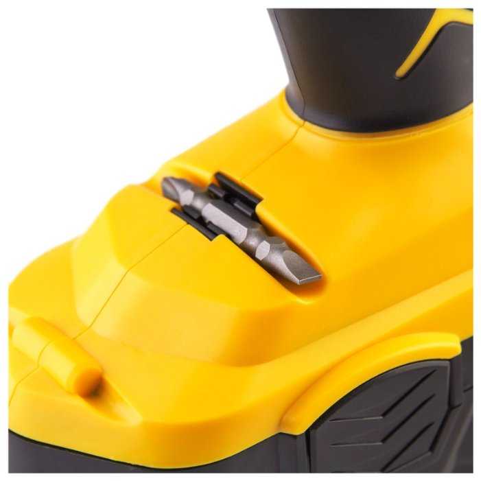 Особенности конструкции : | блокировка кнопки включения, гнездо в корпусе для крепления бит |