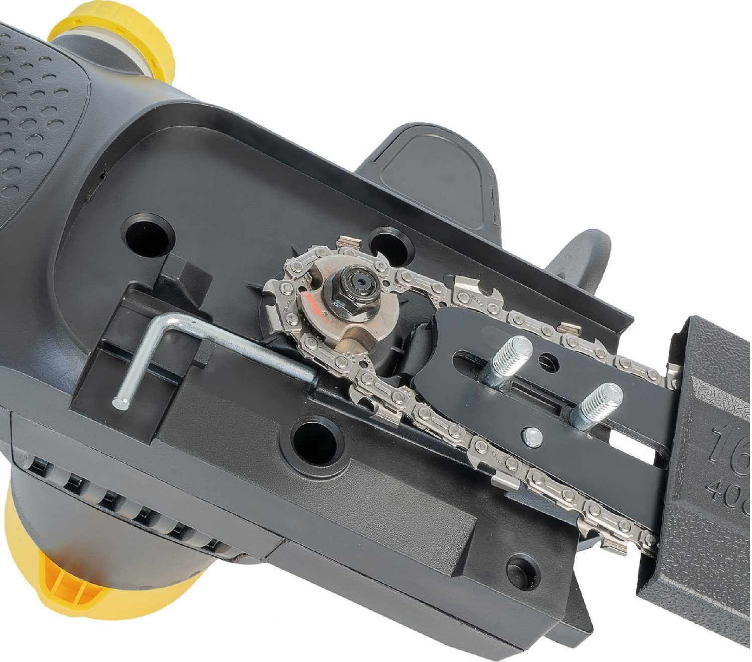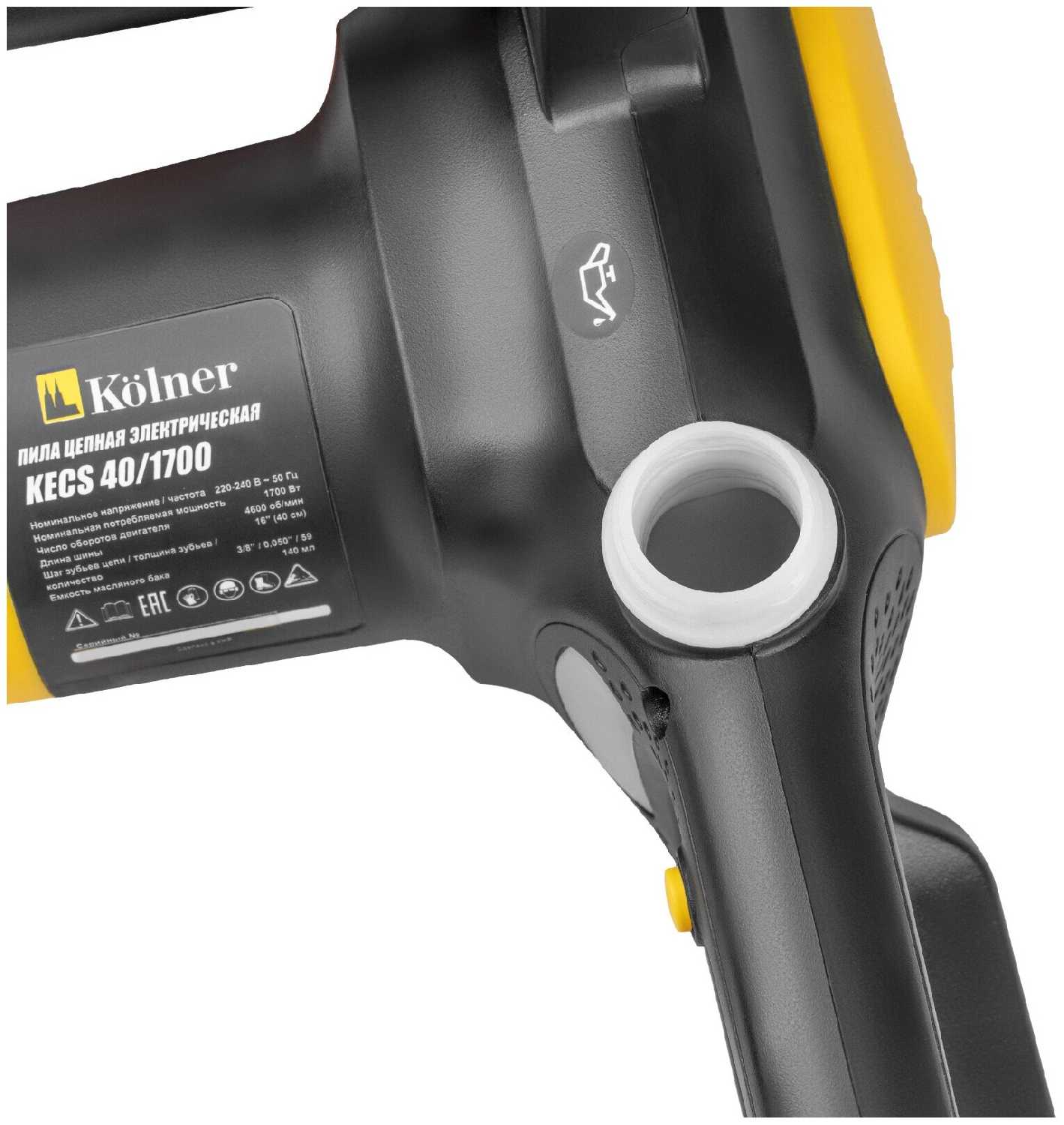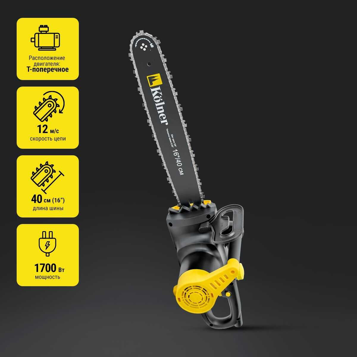 | Особенности конструкции : | бесключевая замена оснастки, блокировка кнопки включения, регулировка натяжения цепи без инструмента |