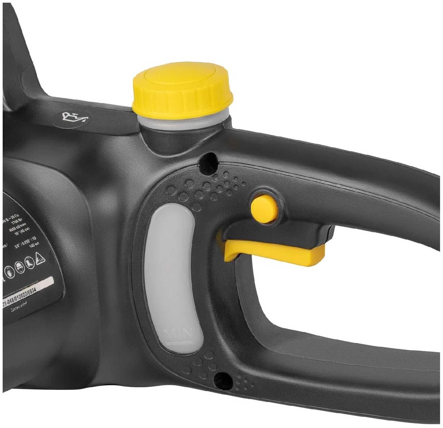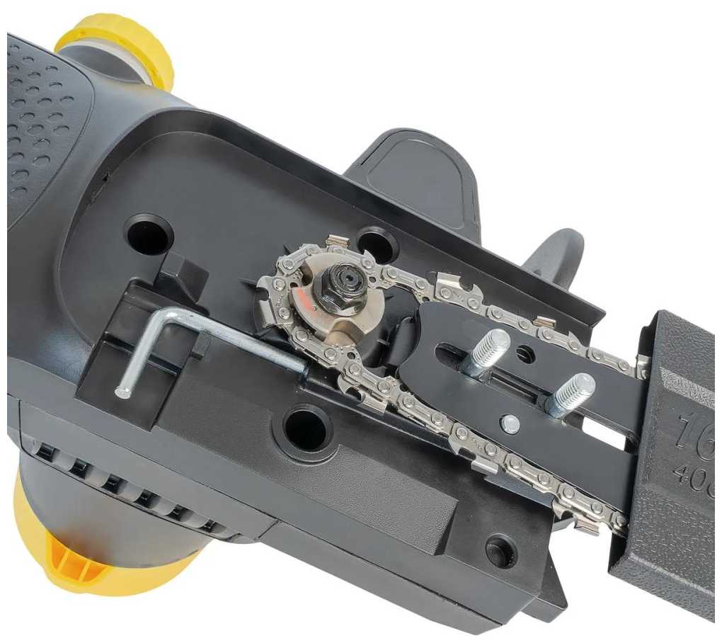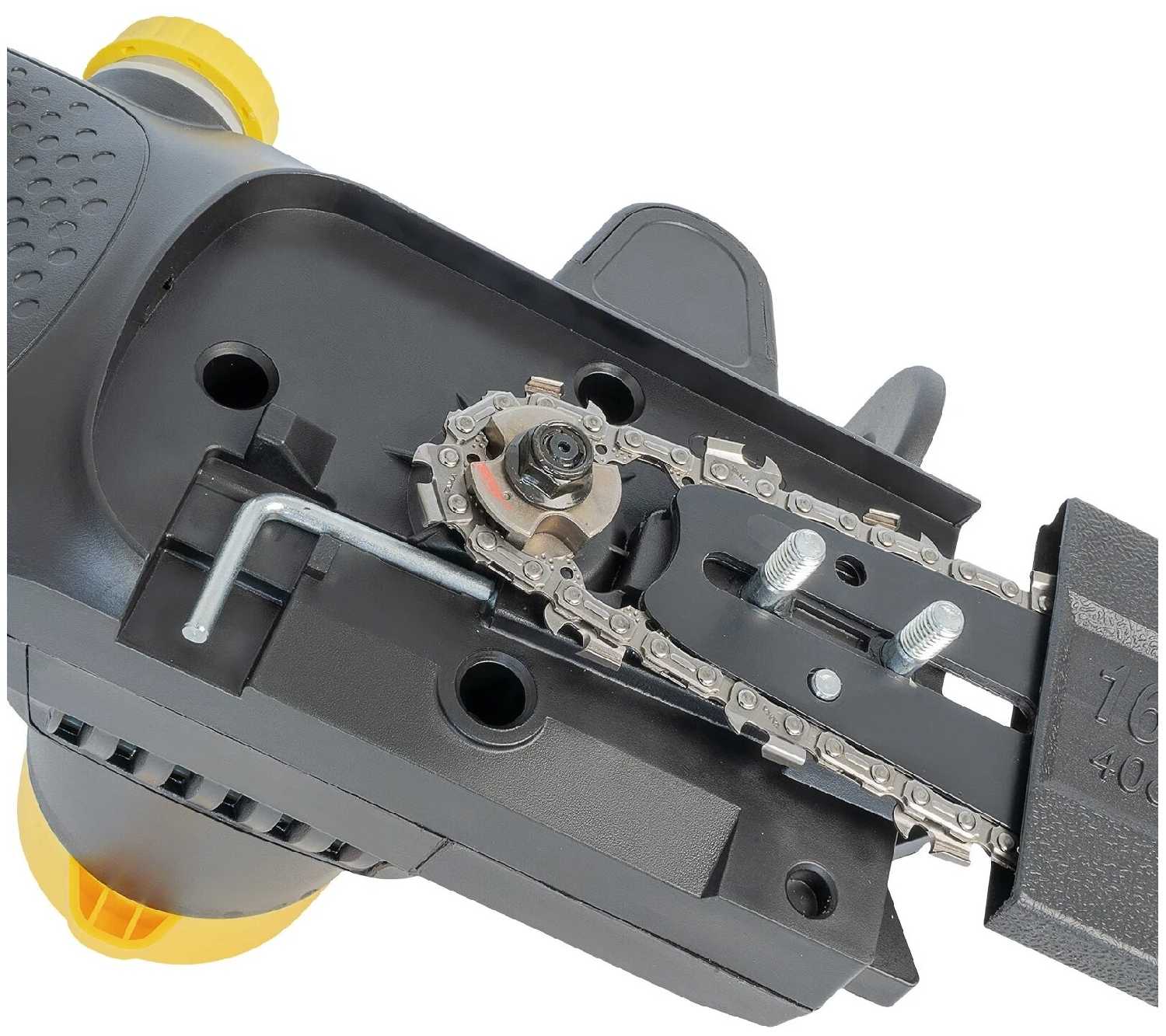 Особенности конструкции : | бесключевая замена оснастки, блокировка кнопки включения, регулировка натяжения цепи без инструмента |