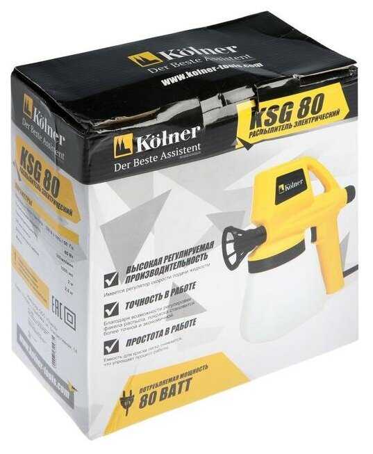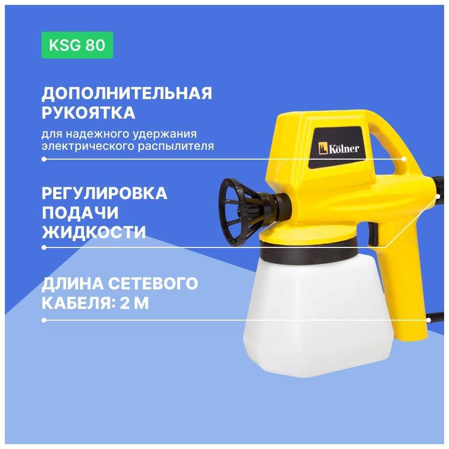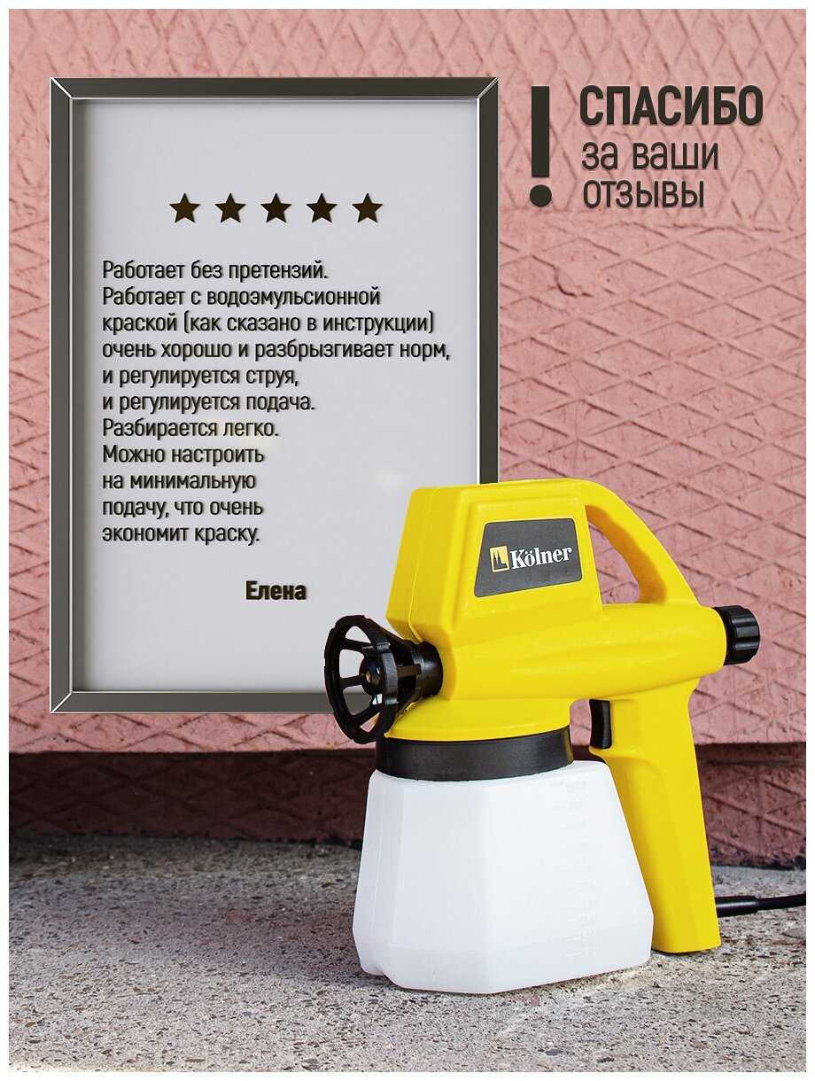 Обрабатываю пиломатериал пропиткой, с краской практически не работаю. Шумит, но работает за 7 месяцев эксплуатации не ломался. Сопло распыляет хорошо. Краскораспылитель Kolner KSG 80 не дорогой надежный инструмент, для частых работ наврятли подойдет, для периодической работы, он хорош.