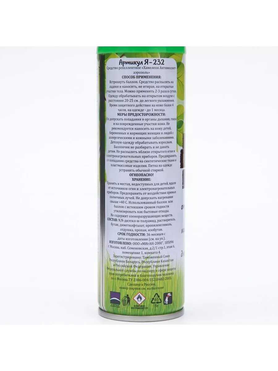 | Способ применения : | Перед применением упаковку встряхнуть в течение 2-3 секунд. Распылить средство на ладонь и нанести, не втирая, на открытые участки тела. Одежду и другие изделия из ткани обрабатывать до легкого увлажнения на открытом воздухе. Располагать одежду и направлять струю средства по направлению ветра. Средство распылять на изделия с расстояния 20-25 см от них, удерживая упаковку на вытянутой руке. |