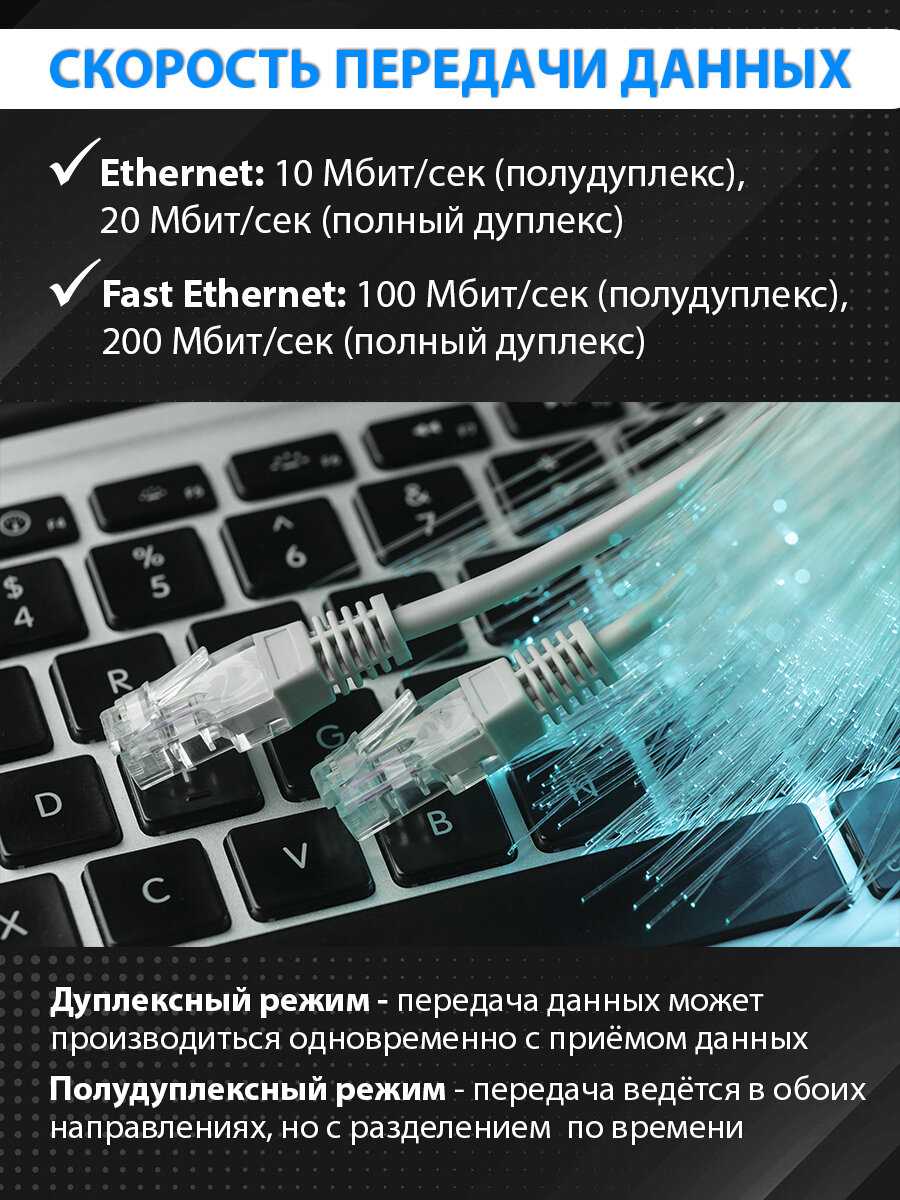 - базовая скорость передачи данных: 10/100 Мбит/с