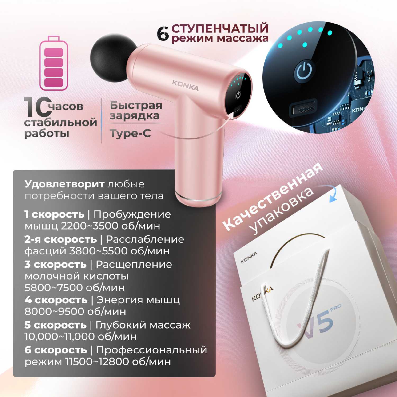 - Технические параметры: мощная амплитуда вибрации (до 3200 ударов в минуту) обеспечивает глубокое воздействие на спазмированные мышцы.