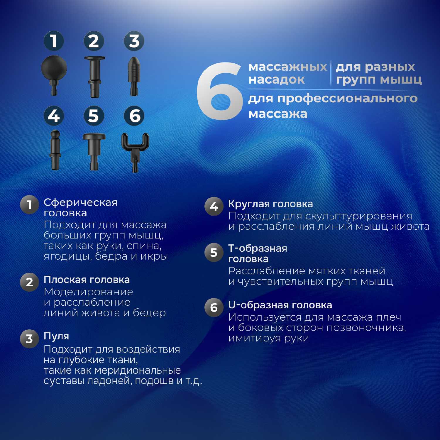 - В комплекте 4-6 сменных насадок разной формы (шарик, шип, плоская головка), адаптированных под зоны тела: шея, стопы, крупные мышцы.