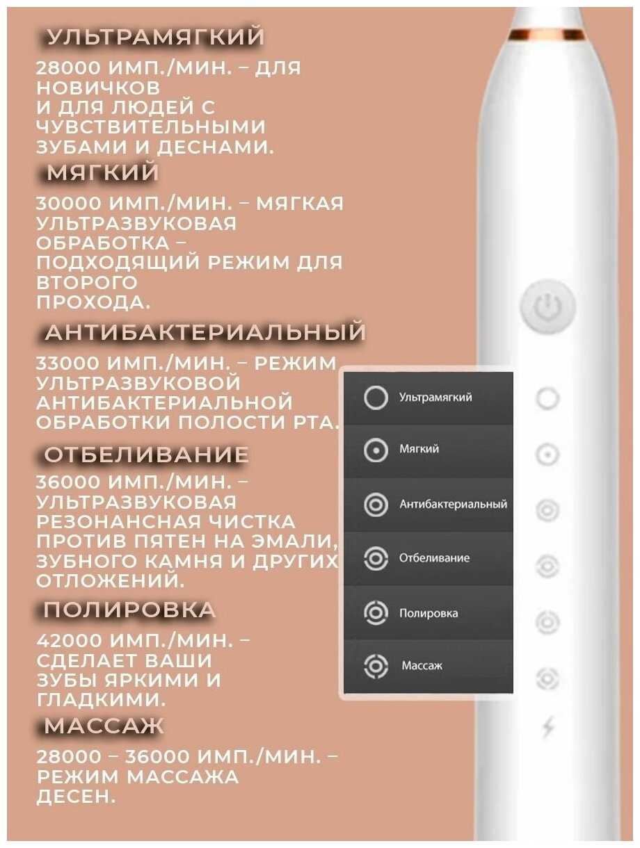 | Режимы работы : | деликатная чистка, ежедневная чистка, массаж, отбеливание, полировка |