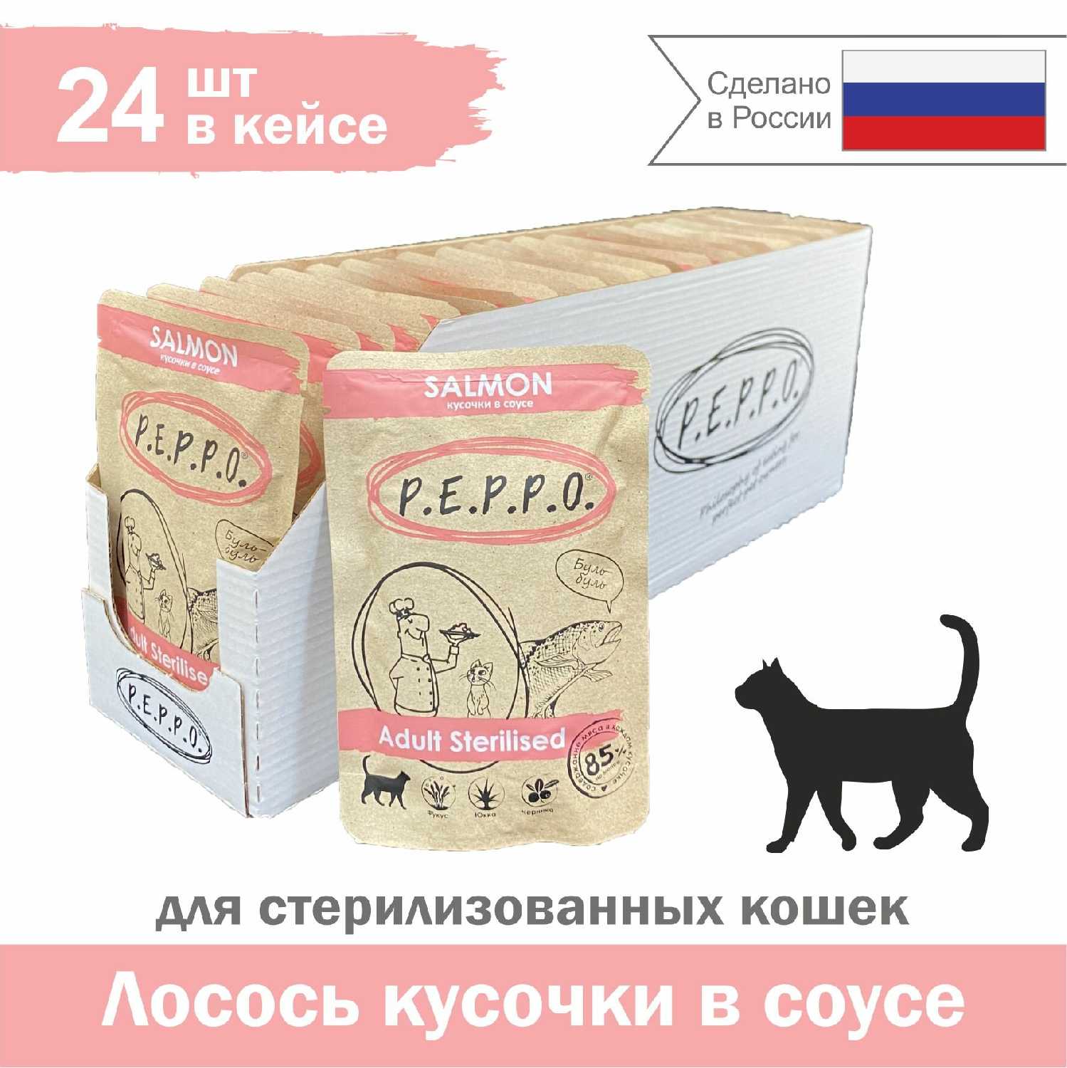 7/10 балловPEPPO Полнорационный консервированный корм для стерильных кошек и кастрированных котов, Лосось кусочки в соусе