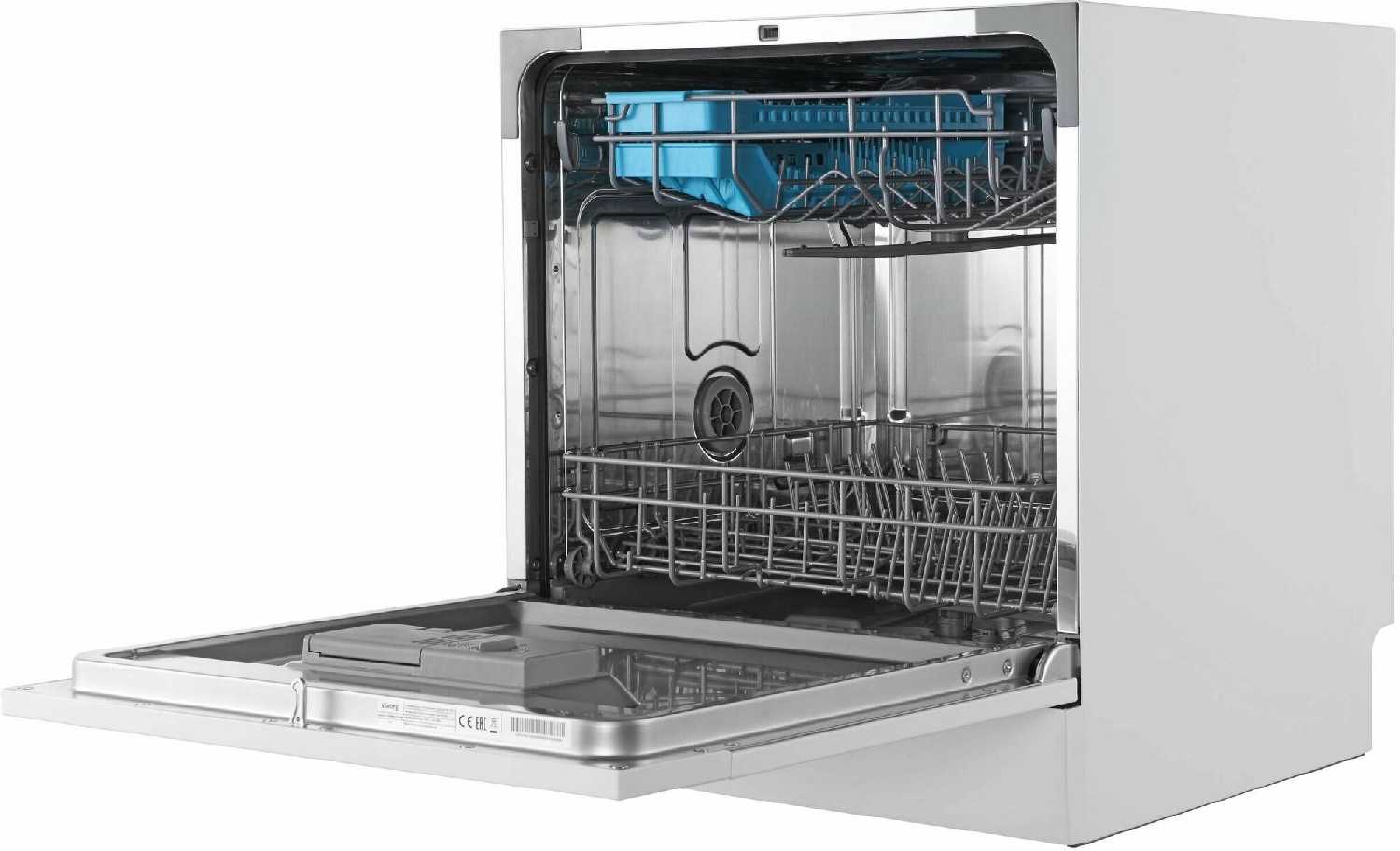 Модель имеет компактные габариты шириной 45-55 см и высотой около 59 см, что позволяет установить её даже на небольших кухнях без перепланировки. Несмотря на скромные внешние размеры, внутренний объём рассчитан на 8-10 комплектов посуды, что подтверждается пользователями, которые размещают внутри кастрюли, сковородки и крупные салатницы. Для оптимального использования пространства производитель предусмотрел две корзины и возможность регулировки высоты одной из них, что позволяет адаптировать внутреннее пространство под высокие предметы. -