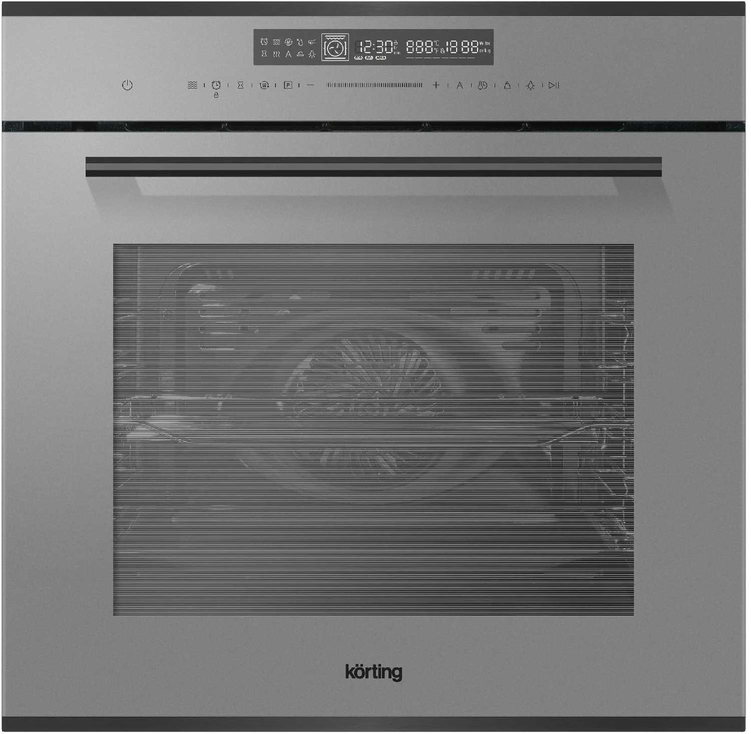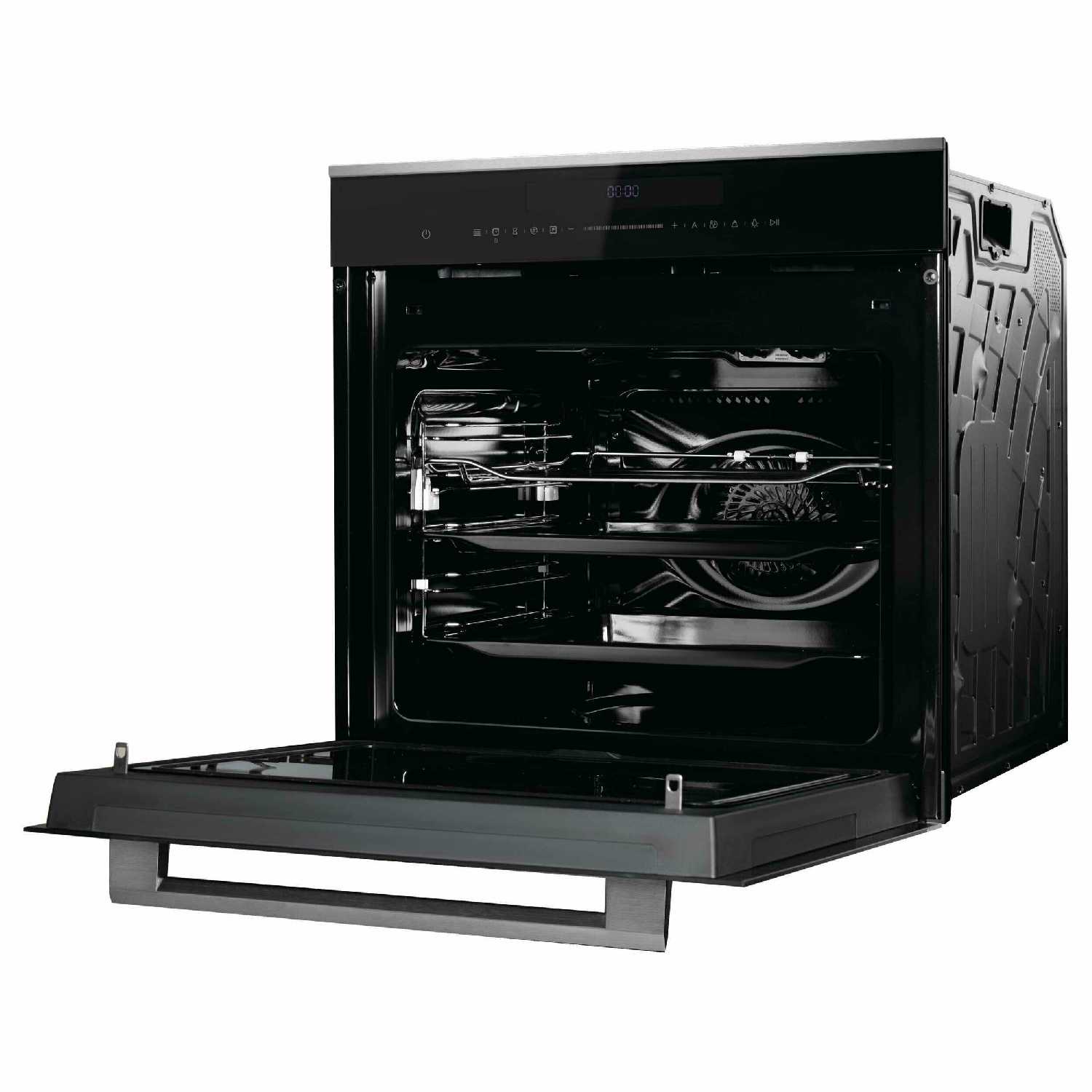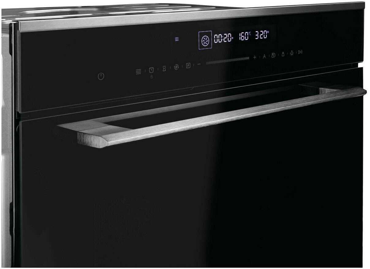 - Даже при температуре 250°C внешняя поверхность дверцы остаётся едва тёплой, что исключает риск ожогов и нагрева кухонной мебели.
