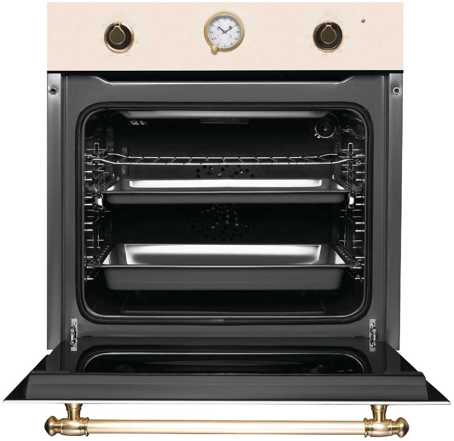 Данная духовка неизменно описывается пользователями как визуально привлекательная модель в ретро-стиле, сочетающая элегантность с современными технологиями. Её бежевый или белый корпус с золотистой окантовкой и фурнитурой "под латунь" органично вписывается в кухни стиля прованс, винтаж или классику, создавая гармоничный ансамбль с другой техникой. Особо отмечается продуманность деталей: стильные поворотные рычаги управления, массивная ручка дверцы и отсутствие выбивающихся из концепции элементов. Пользователи подчеркивают, что духовка не просто функциональный прибор, а полноценный элемент дизайна, который "украшает кухню" и вызывает эстетическое удовольствие даже в выключенном состоянии.