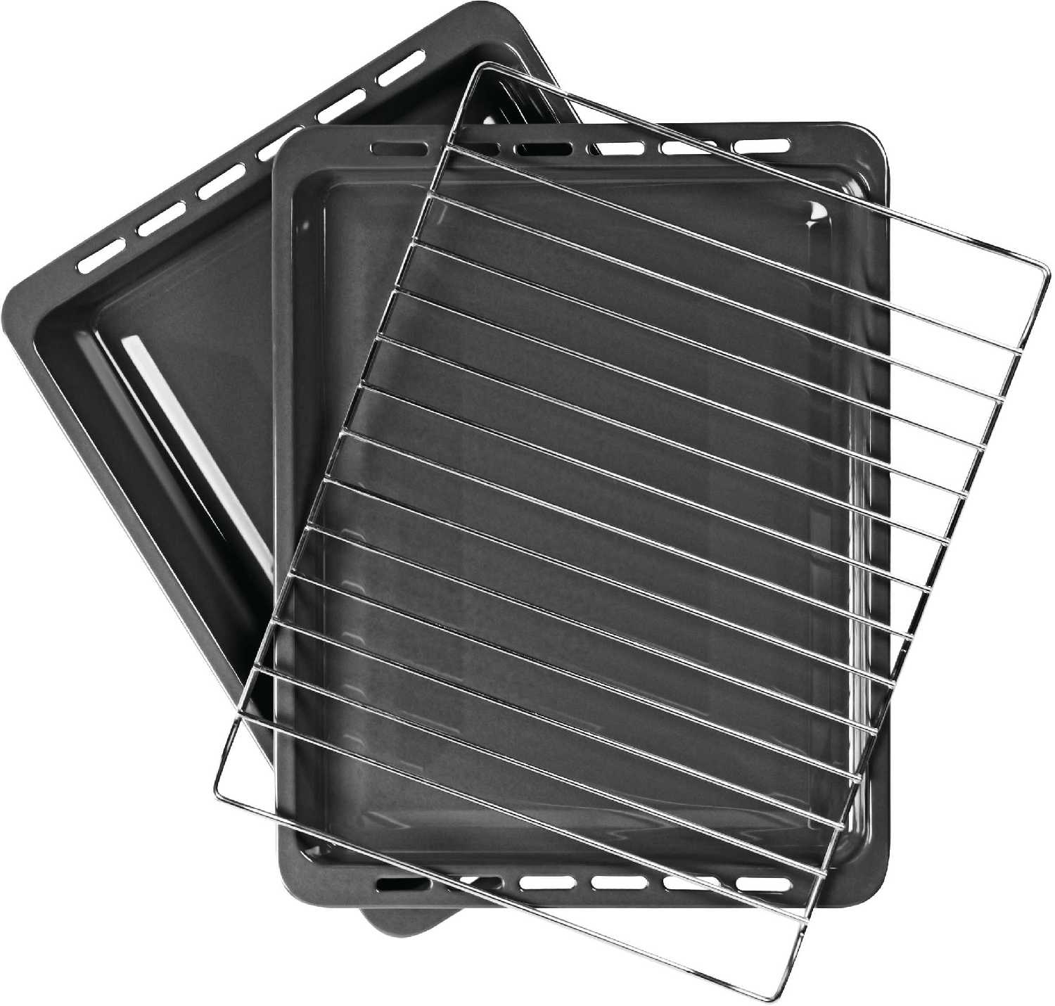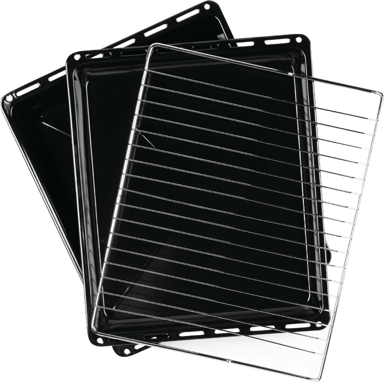Стандартно включаются: глубокий противень для запекания, плоский лист для выпечки и решетка гриля. Телескопические направляющие совместимы со всеми аксессуарами, обеспечивая плавное выдвижение даже с нагрузкой до 3 кг.