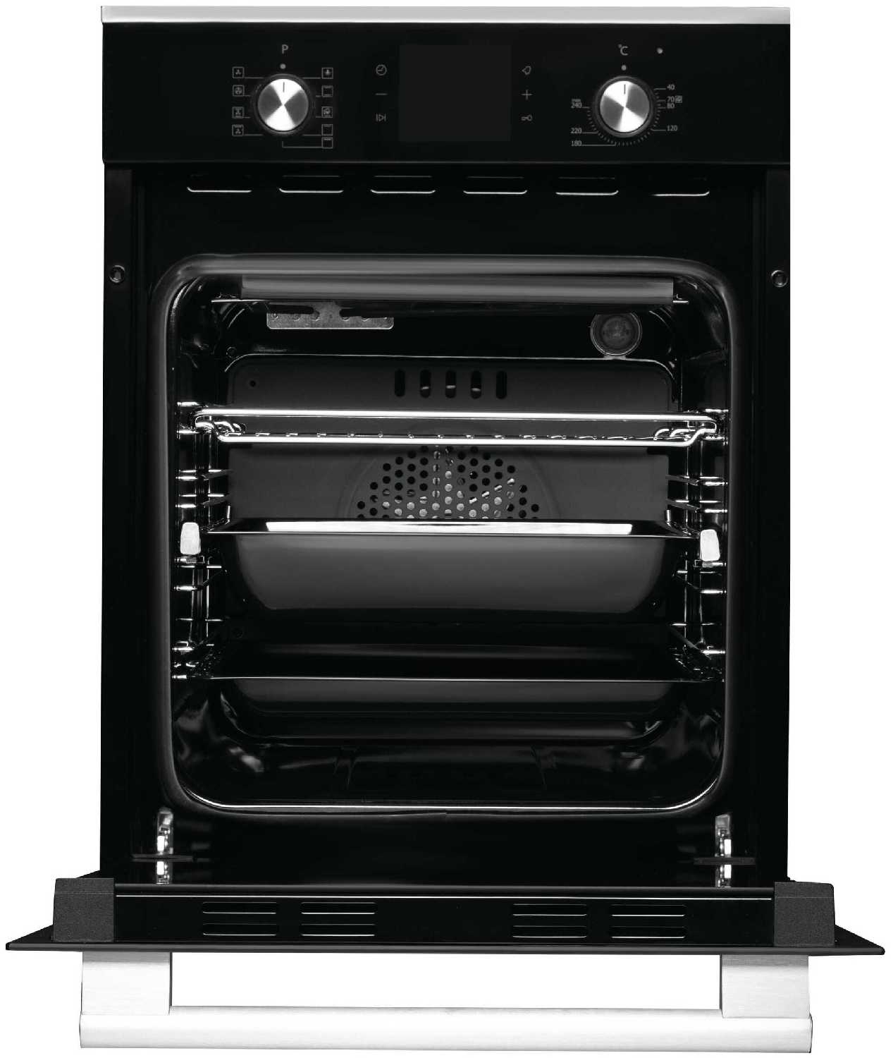 Стильный дизайн, компактный, удачный размер для маленькой кухни. Большое количество режимов, наличие 2х противней (плоский и с высокими бортами). Удобные телескопические направляющие, жаль только на одном уровне.