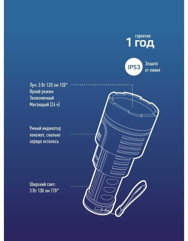 Особенности : | USB-зарядка, влагозащита, дневной белый свет, индикация заряда, кабель USB, прожектор, ударопрочный корпус |