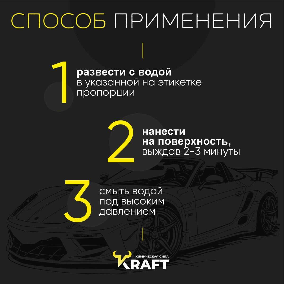 Способ применения : | развести с водой в указанной на этикетке пропорции, нанести на поверхность, выждав 2-3 минуты, смыть водой под высоким давлением. |