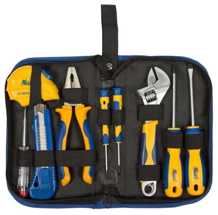 Набор универсальный, есть все необходимое. Я давно хотел такой, т.к. у меня хоть и были инструменты, но все еще от отца достались, стертые и покоцанные. Поэтому купил эту сумочку с инструментами. В составе разводной ключ, рулетка, пассатижи, отвертки – все что пригодится в хозяйстве. Причем ручки очень удобные, то ли прорезиненные, толи каким-то материалом отделаны – не скользят.