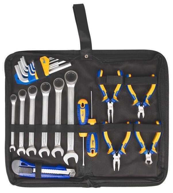 | Инструменты в комплекте : | бокорезы, длинногубцы, ключ разводной, ключи гаечные, ключи имбусовые (шестигранные), круглогубцы, кусачки, молоток, отвёртки, пассатижи, плоскогубцы, трещотка |