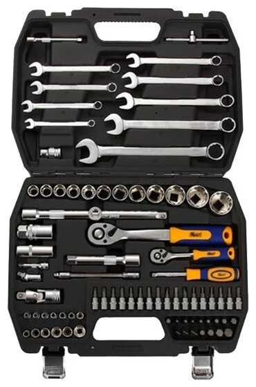 | Инструменты в комплекте : | вороток для головок, ключ разводной, ключи имбусовые (шестигранные), ключи торцевые, пассатижи, плоскогубцы, рукоять для бит, трещотка |
