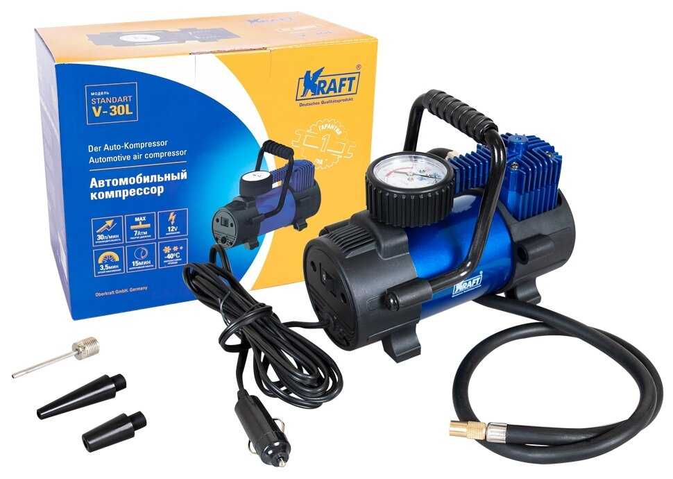 Взял себе автомобильный компрессор Kraft standart. Есть в комплекте 3 насадки. Максимальное давление у него идёт 7 Атм. Производительность 30 л/мин. Также есть в комплекте чехол и встроенный манометр. Цвет у него черно-синий. Покупкой остался доволен.