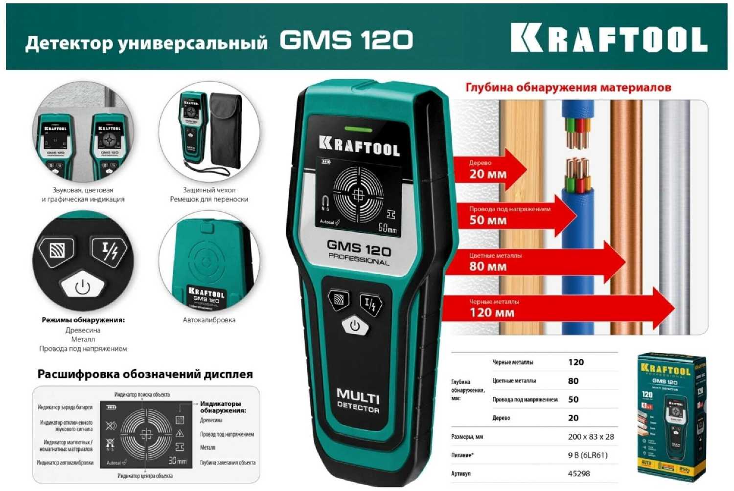 Обнаруживаемые материалы : | деревянные конструкции, цветные металлы, черные металлы, электропроводка |