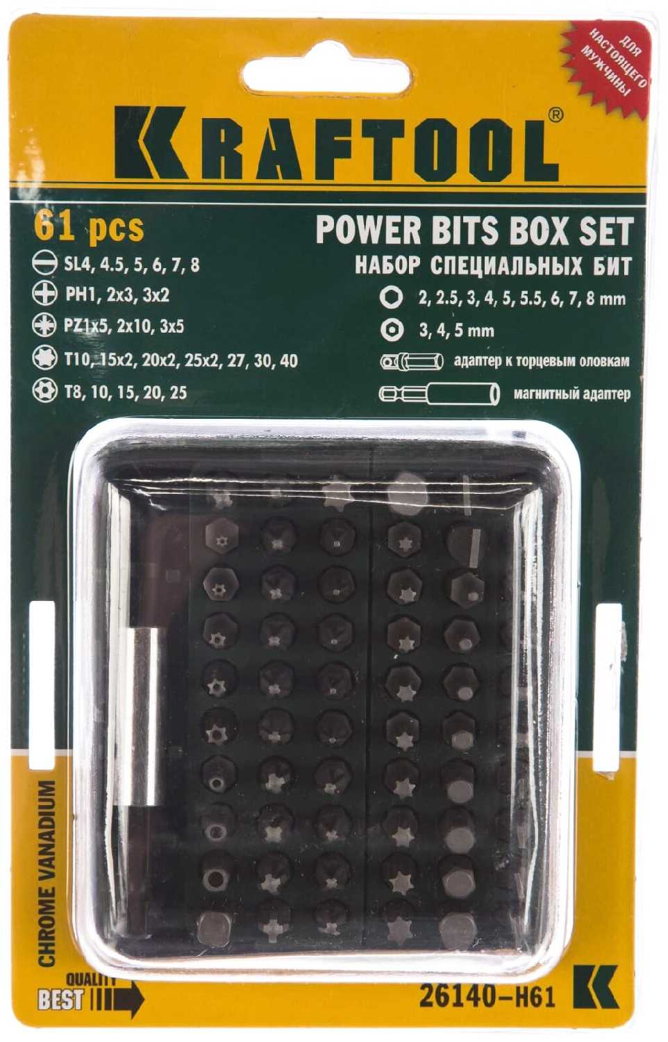 | Дополнительная информация : | Кейс упрощает транспортировку набора бит KRAFTOOL Cr-V 26140-H61, Большое количество бит в комплекте (59 шт). |