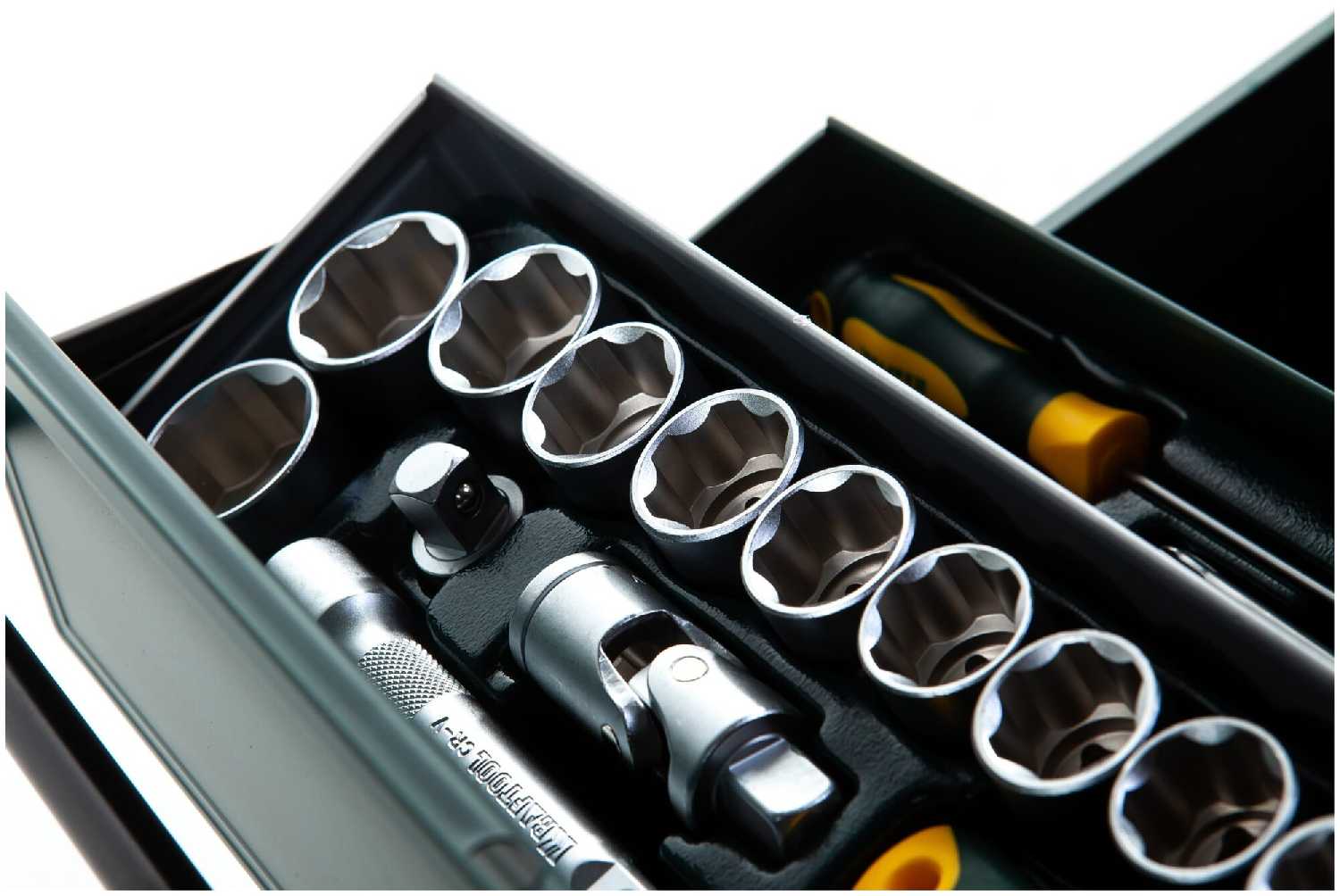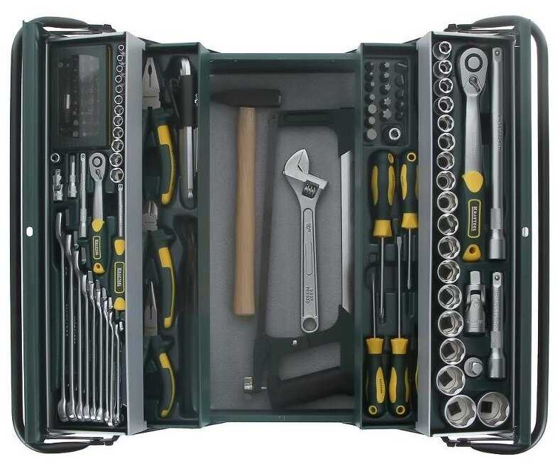 | Инструменты в комплекте : | бокорезы, вороток для головок, длинногубцы, клещи, клещи переставные, ключ переставной гаечный, ключ разводной, ключ трубный рычажный, ключи гаечные, ключи имбусовые (шестигранные), ключи торцевые, круглогубцы, кусачки, молоток, ножовка по дереву, ножовка по металлу, отвёртки, отвёртки для точных работ, пассатижи, плоскогубцы, рукоять для бит, рукоять для головок, тонкогубцы, трещотка |