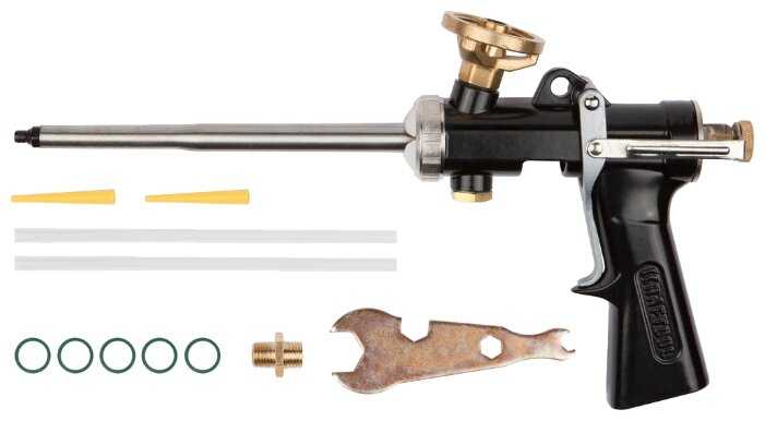Качественный пистолет от известного производителя. Плавно регулирует подачу пены. Пена не засыхает в пистолете. Длинный ствол - можно подлезть везде. В комплекте дополнительные прокладки. Разбирается и чистится без проблем.