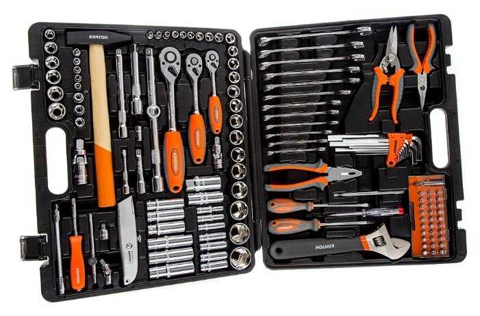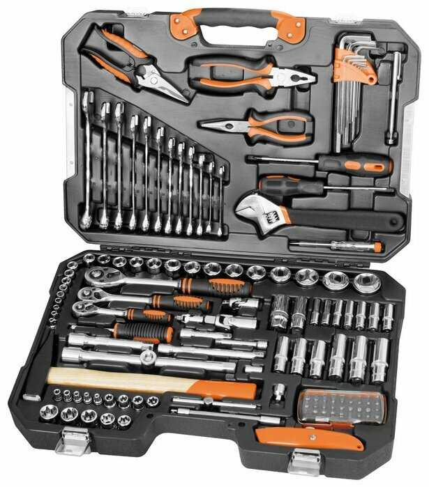 Инструменты в комплекте : | вороток для головок, ключ разводной, ключи гаечные, ключи имбусовые (шестигранные), ключи торцевые, молоток, отвёртки, пассатижи, плоскогубцы, рукоять для бит, тонкогубцы, трещотка |