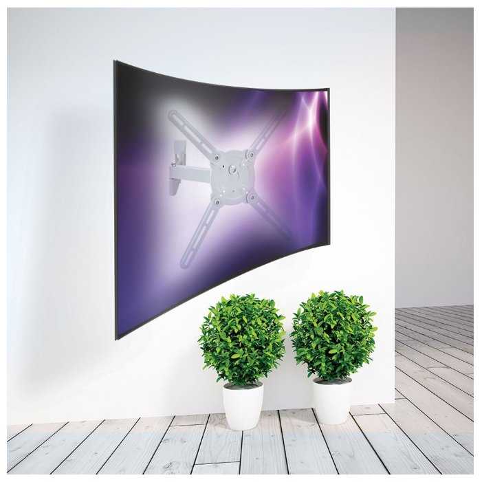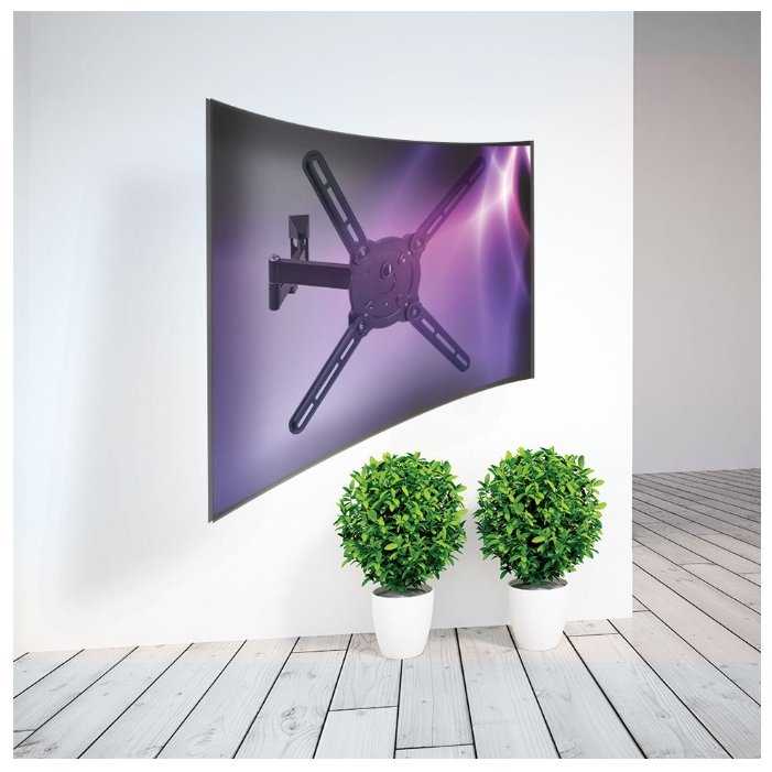 Кронштейн без заморочек, с простой сборкой и установкой. Брали для монтажа в гостиной для нового изогнутого телевизора, который приобрели чуть раньше. Телевизор не маленький, диагональ у него 65 дюймов, вес чуть более 30 килограмм, стандарты креплений 400 на 400. Этот кронштейн подошел: диагональ по максимуму, а по весу остался запас, его можно нагружать до сорока килограмм, стандарты креплений тоже подошли, у этого кронштейна они в девяти вариантах. Кронштейн функциональный, он и поворачивается, его можно наклонять и выдвигать от стены чуть более, чем на 40 сантиметров. Держит телевизор хорошо, ходит умеренно туго, под тяжестью телевизора не отвис ( висит второй месяц), вообщем, для этой ценовой категории экземпляр достойный и внимания определённо заслуживает- рекомендовать можно смело.
