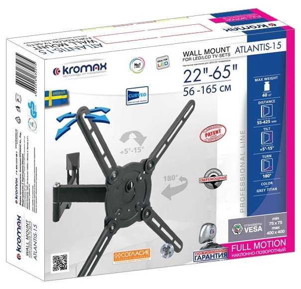 Изначально планировал приобрести совершенно другую модель кронштейна, уже даже в корзину его добавил, оставалось только заказ оформить, но увидев этот Kromax Atlantis-15 Grey, решил сэкономить и купить его. Цена почти вдвое дешевле, а по нагрузке абсолютно такой же. Конечно не хотелось экономить в ущерб качеству, поэтому отыскал его в магазине, посмотрел вживую и купил без раздумий. Кронштейн крепенький, из хорошей стали, с прочным шарнирным соединением- выдержит мой телевизор запросто! У моего диагональ 48, а кронштейн заявлен и под 65, с максимальным весом до 40ка. Стандарт креплений тоже подошёл, их тут девять разных вариантов. Функционал, как и хотелось-и в стороны поворачивается, и наклон есть, от стены тоже выстреливает, не на полтора метра конечно, всего на 40 см., но тем не мене. Вообщем, кронштейн отличный - ни разу не пожалел о приобретении!