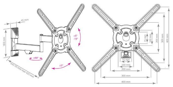 - Поворот в стороны до 180°, наклон ±5-15°, выдвижение от стены до 42,5 см, вращение экрана на ±5° для выравнивания.