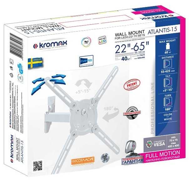 - Подходит для диагоналей 22-65 дюймов, стандартов VESA до 400x400 (9 вариантов креплений).