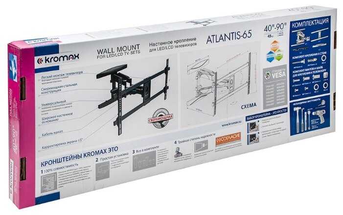 Кронштейн отличный, очень крепкий и тяжелый. Держит телевизор 75 дюймов и весом 30 кг. Повороты, наклоны очень удобно регулировать