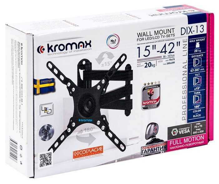 Отличный кронштейн для небольших телевизоров. Взял себе на кухню для телевизора 32 дюйма. По качеству изготовления придраться не к чему - все сделано отлично. Стандарты VESA поддерживает все, какие можно придумать для его расчетной нагрузки. В наличии крепеж на все возможные отверстия телевизоров. В комплекте подробная инструкция. Последнее время беру и рекомендую знакомым кронштейны только этого производителя