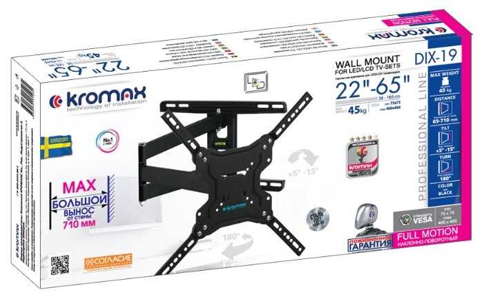 Мне нужен был кронштейн с максимальным выносом от стены, чтобы смотреть ТВ с дивана, параллельного стене. То есть в рабочем положении ТВ располагается перпендикулярно стене. У этого кронштейна вылет максимальный 71 см. (реально получается 67 от плоскости стены до оси ТВ с учетом поворота самого ТВ перпендикулярно стене). Это позволяет навесить телевизор с диагональю 55’’, остаётся запас до стены 4 см от края ТВ.
