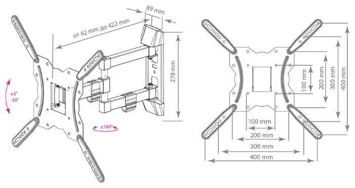 | Дополнительная информация : | угол наклона +3 -10°, угол поворота 180°, диагональ экрана 56-165 см, расстояние от стены 6.2-42.2 см |