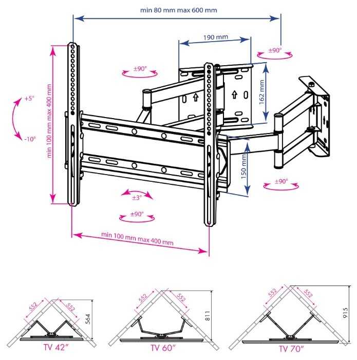 Благодаря конструкции кронштейна я в одиночку прикрутил его к стене и подвесил 65 дюймовый ТВ. Хоть в инструкции к ТВ и было написано про обязательное перемещение ТВ двумя людьми. Разъёмы у моего ТВ оказались под кронштейном, что не даёт кабелям замяться при складывании кронштейна (смотри фото).