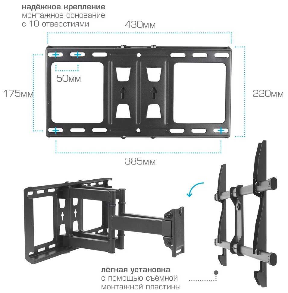 - Множественные точки крепления к стене (до 6 отверстий) обеспечивают стабильность даже для крупногабаритных моделей (65–75 дюймов).