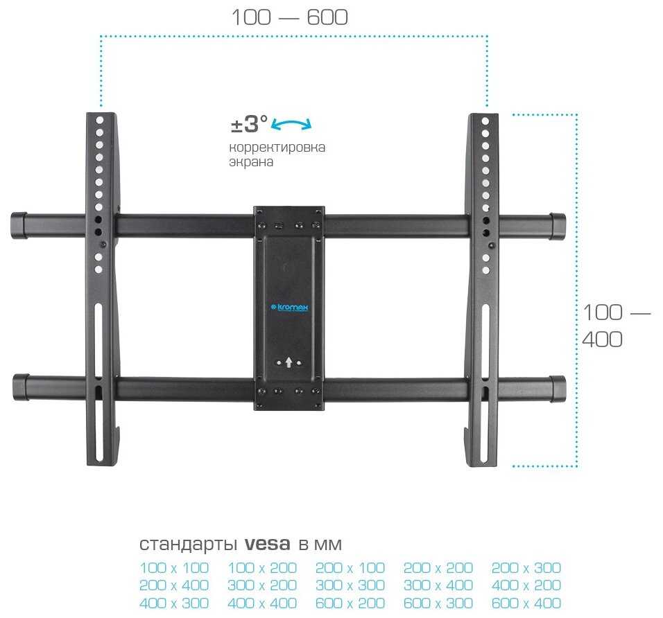 - Универсальные отверстия под VESA 200–600 мм совместимы с большинством современных телевизоров.