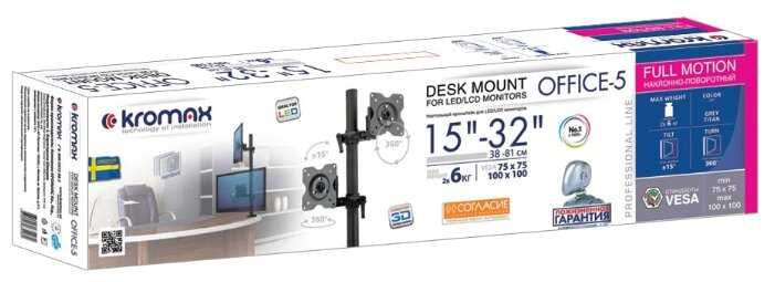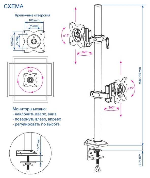 | Дополнительная информация : | для 2 мониторов весом до 6 кг каждый, вращение экрана на 360°, съемная монтажная пластина |